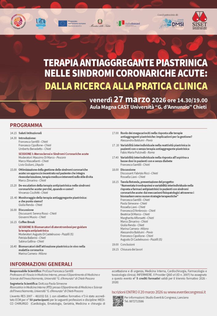 Le sindromi coronariche acute (SCA) rappresentano una delle principali cause di morbilità e mortalità cardiovascolare a livello globale. Su questo tema di primaria importanza per la salute si confronteranno studiosi provenienti dai migliori centri del Paese nella giornata di venerdì 27 marzo presso l’Aula Magna del CAST dell’Università “D’Annunzio” a Chieti”. L’iniziativa è promossa dal Dipartimento di Medicina, diretto da Francesco Cipollone, che ha affidato la Direzione scientifica del convegno a Francesca Santilli, Professore in Medicina Interna, presso il Dipartimento di Medicina e Scienze dell’Invecchiamento dell’Università.