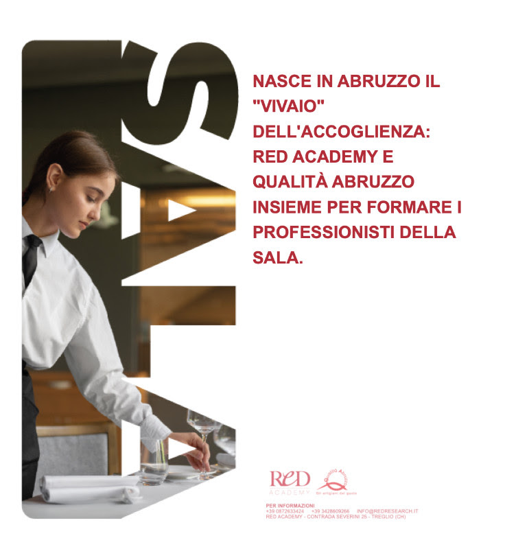 “Accrescere la professionalità del comparto e dunque investire in formazione di alto livello è fondamentale per rendere attrattivo il lavoro e costruire opportunità professionali concrete. Il nostro progetto punta a formare personale di sala qualificato, senza dubbio una delle sfide più complesse del settore della ristorazione. Con questi corsi di alta specializzazione intendiamo far crescere veri e propri Ambasciatori dell’Accoglienza – dichiara il presidente di Qualità Abruzzo Raffaele Cavallo – e creare, insieme alla Red Academy, uno standard di servizio che diventi un vanto per la nostra regione e un motore di crescita occupazionale”.