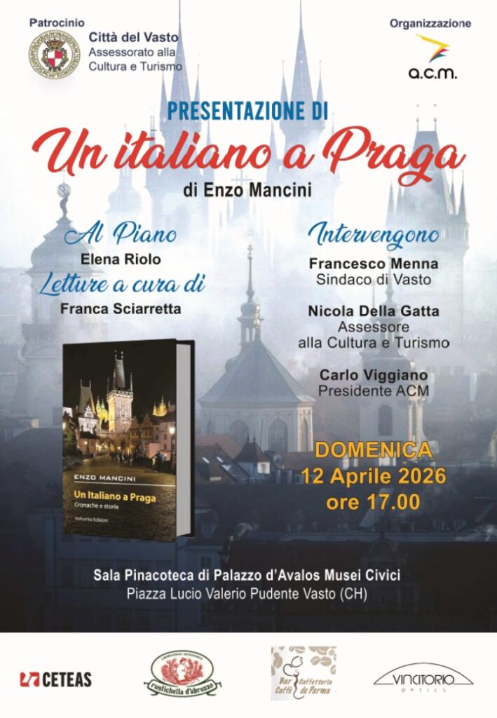Le attività culturali dell’ACM Vasto (Associazione di Competenze Multidisciplinari) riprenderanno, per il corrente anno, Domenica 12 aprile 2026 alle ore 17.00 presso la sala Pinacoteca di Palazzo d’Avalos della Città del Vasto con la presentazione del libro “Un Italiano a Praga.”