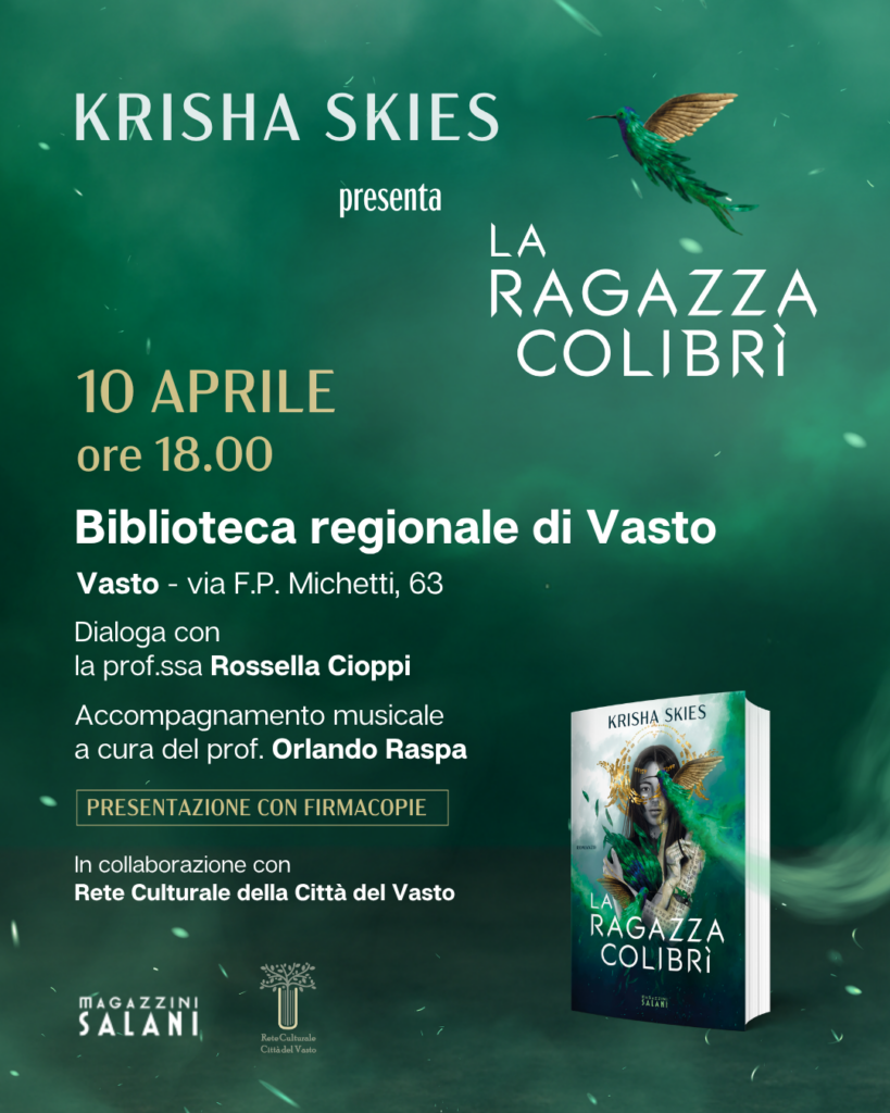 Il giorno 10 aprile, alle ore 18:00, presso la Biblioteca Regionale APC Vasto (via Michetti 63, Vasto), si terrà la presentazione del romanzo “La ragazza colibrì”, edito dalla casa editrice Magazzini Salani, scritto dalla vastese Krisha Skies. L’autrice dialogherà con la prof.ssa Rossella Cioppi. La lettura di alcuni brani tratti dal libro sarà accompagnata al piano dal prof. Orlando Raspa. ” La ragazza colibrì”, romantasy ispirato alle civiltà precolombiane, segna l’esordio di Krisha Skies con la prestigiosa casa editrice Magazzini Salani dopo un’intensa attività come scrittrice che l’ha portata alla pubblicazione di più di dieci romanzi tra il 2021 e il 2025 e le è valso il Premio Watty 2022.