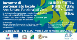 Nell’ambito del percorso di costruzione della Strategia Territoriale dell’Area Urbana Funzionale di Vasto, il GAL Costa dei Trabocchi , per conto della Coalizione Territoriale, con Vasto ente capofila, promuove un momento di presentazione e confronto con il partenariato locale, finalizzato alla condivisione degli indirizzi strategici e alla raccolta di osservazioni e contributi.