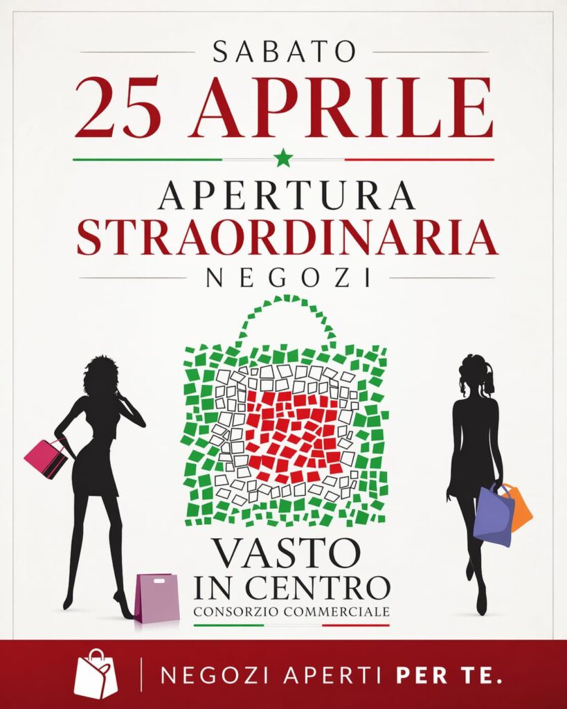 Apertura straordinaria dei negozi nel centro storico in occasione della giornata festiva odierna, 25 aprile. Ad annunciarlo è il Consorzio Vasto in Centro, il sodalizio che raggruppa le attività commerciali presenti nell’antico borgo e che per la festa della Liberazione hanno deciso di non abbassare le saracinesche. L’idea nasce dalla volontà di accogliere nel migliore dei modi i vastesi e i turisti che decideranno di trascorrere il giorno di festa tra le vie della città, permettendo loro di godersi una passeggiata rilassante a piazza Rossetti, corso De Parma e piazza Del Popolo, trovando le serrande alzate e le vetrine illuminate.